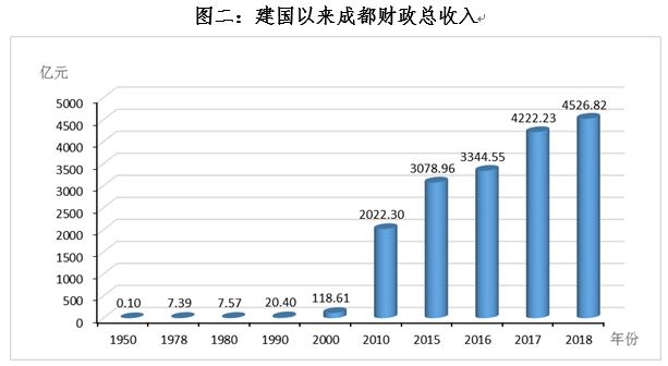 经济总量不断实现新跨越。1949年全市地区生产总值(GDP)仅4亿元、1958年突破十亿元、1987年突破百亿元、1999年突破千亿元、2014年突破万亿,2018年达到1.5万亿元,经济总量位列副省级城市第三位。成都用70年的时间,实现了经济总量成千倍的增长,实现了经济总量向万亿元的跨越。70年来全市地区生产总值年平均增长12.7%。人均地区生产总值1949年仅77元,1978年提高至448元,2018年达94782元。其中2013年首次突破万美元大关,自始成都经济社会整体发展达到中等发达国家水平。