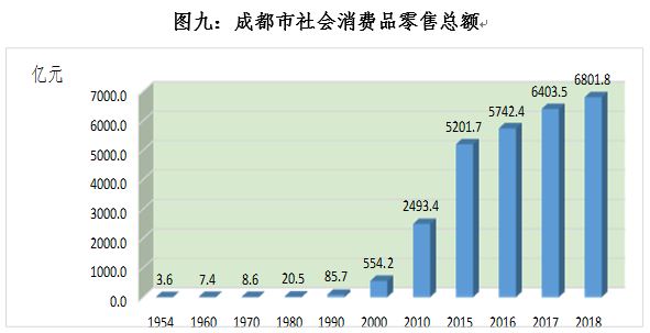 消费能级不断提升。随着成都市城乡居民收入的快速增长,消费水平和能级不断提升,实现由生存型消费向改善型消费的巨大跨越。全市社会消费品零售总额从1952年2.6亿元跃升至2018年的6801.8亿元。2018年成都市城镇居民人均消费支出达27312元,比1954年的138元增长近200倍。2018年末全市机动车总数548.44万辆,私人汽车420.28万辆。机动车保有总量位列全国第二。