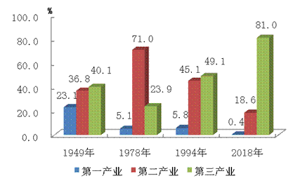 第三产业逐步成为主导产业。新中国成立之初,北京基本是个消费城市,产业发展呈低水平的“三二一”发展格局,第三产业比重为40.1%,分别高于第一、第二产业17个百分点和3.3个百分点。20世纪50年代初到改革开放前,北京以建设现代化工业基地为目标,第二产业成为经济发展的主导产业。1954年第二产业比重为44.1%,首次超过第三产业,1978年比重达到71%。20世纪80年代以来,北京逐步调整产业结构,明确第三产业为主导产业。1994年,第三产业比重再次超过第二产业,并持续提高,“三二一”的产业结构基本确立。1998年北京第三产业比重超过60%,2005年超过70%,2016年达到80%以上,2018年三次产业比例为0.4:18.6:81,与1949年相比,第三产业比重提高40.9个百分点,对经济增长的贡献率超过8成,成为全市经济的“压舱石”。