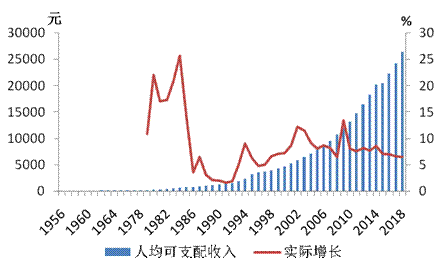 图7 1955-2018年城镇居民人均可支配收入及实际增速