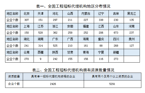 2018年度参加统计的全国工程招标代理机构共7717个,比上年增长24.31%。按照企业登记注册类型划分,国有企业和国有独资公司共276个,股份有限公司和其他有限责任公司共3757个,私营企业3528个,港澳台投资企业2个,外商投资企业4个,其他企业150个。具体分布见表一、表二: