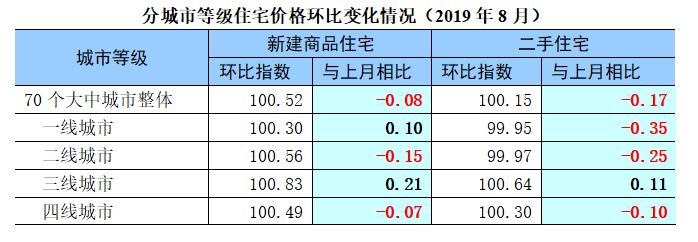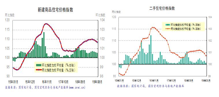 在政策的有效引导下,2019年8月,全国商品住宅价格继续保持小幅回落。从同比指数看,新建商品住宅价格同比指数为108.3(加权平均值),比上月回落0.7个点,二手住宅同比指数为103.7,比上月回落1个百分点。从环比指数看,新建商品住宅为100.5,比上月回落0.1个点,二手住宅为100.1,比上月回落0.2个点。