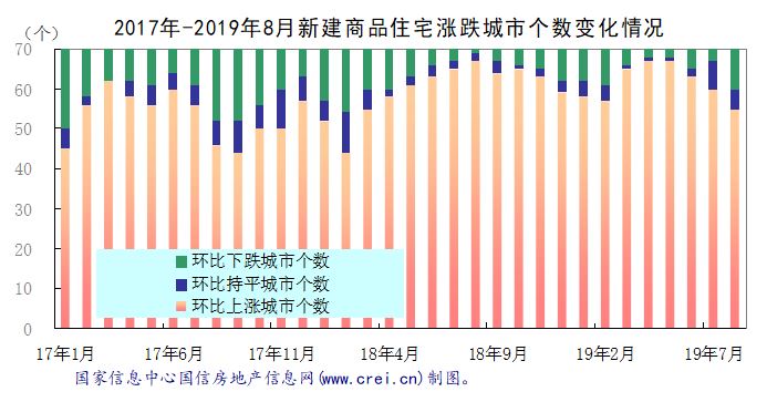 从涨跌城市个数来看,8月份70个大中城市中有55个城市新建商品住宅价格环比上涨,5个城市持平,10个城市下跌。与7月相比,上涨城市个数减少5个,持平城市个数减少2个,下跌城市个数增加7个,下跌城市个数达到16个月来的最高点。