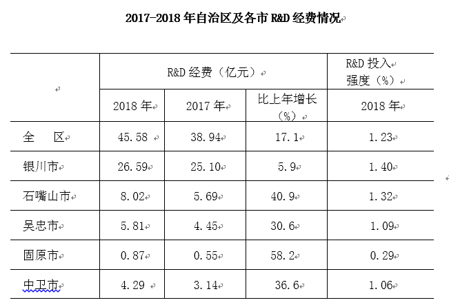 2018年银川市大力实施创新驱动发展战略,科技创新能力进一步增强,据自治区科技综合年报反馈,研究与试验发展经费(R&D,下同)平稳增长,研发投入强度(R&D经费支出与地区生产总值之比,下同)有所提高。