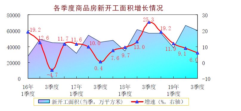 商品房新开工面积增速明显放缓。三季度当季,全国商品房新开工60198万平方米,同比增长6.0%,增速比二季度回落3.1个百分点,连续四季度保持回落,由2018年3季度的25.3%回落至当前的6.0%,累计回落幅度达19.3个百分点。商品住宅新开工面积走势与之类似,回落走势更加明显,三季度当季商品住宅新开工增长6.0%,增速比二季度回落3.9个百分点。分区域看,西北、西南、东北新开工增长较快,均在10%以上,华东和华南均增速较慢,不到5%,特别是华南地区,受广东和海南新开工面积均下降的影响,整体出现负增长,下降1.6%。