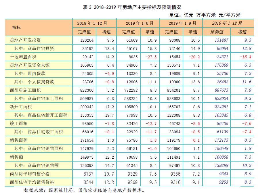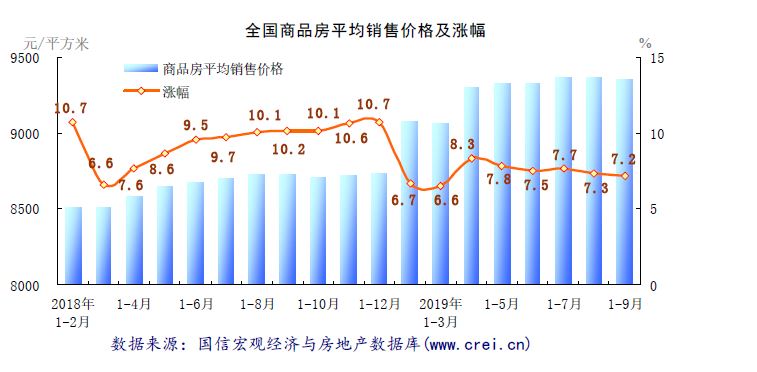 房价绝对水平保持高位,价格涨幅有所回落。2019年前三季度,商品房平均销售价格为9355元/平方米,同比上涨7.2%,涨幅与2018年全年相比回落3.5个百分点,后期预计在企业加大促销力度的带动下,预计房价平均涨幅会进一步回落。