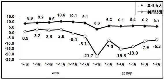 图8 2018年7月以来计算机制造业增加值和出口交货值分月增速(%) 1-7月,计算机制造业营业收入同比增长4.9%,利润同比下降4.2%。 (文中统计数据除注明外,其余均为国家统计局数据或据此测算) |
