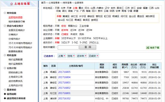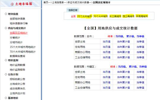 地址:http://www.crei.cn/tudi/主要内容:全国各城市土地市场监测数据,包括 全国所有通过招拍挂出让土地的地块详情信息、地块信息排行、土地供应与成交数据、地价监测数据及基准地价信息等 。数据库中已有土地地块信息77万条以上,并可通过城市、区县、土地名称(编号)、规划用途、出让日期、成交日期、成交状态、土地面积、成交总价、成交人等信息进行查询。 数据系按月度汇总统计上一月度各城市、地区、重点区域的土地供应与成交数据。数据来源:各城市国土资源管理部门和 自然资源部(原国土资源部)。 更新频率:地块信息更新周期为每日更新,统计信息为按月更新,每月10号更新上一月的相关统计信息。 主要界面: 地块信息浏览查询
